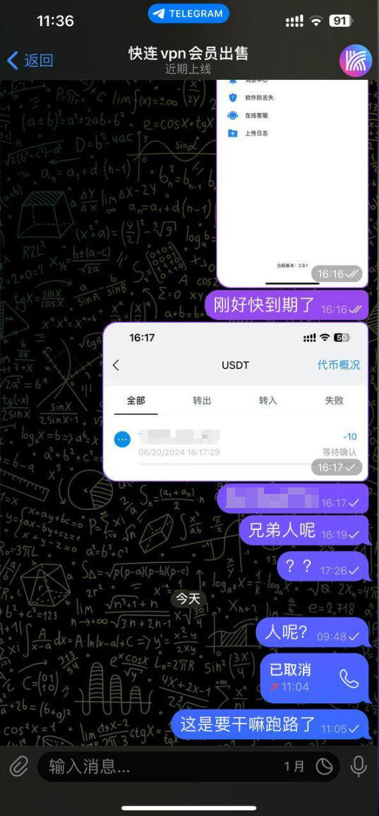 在 Telegram上,”我“ 被一则声称通过“特殊渠道”仅需 10u 便能年购快连 VPN 的广告吸引。广告中的产品标志和精心设计的文案让我误以为找到了正规特价分销商。被这样的诱惑所迷,我几乎没有犹豫,立即通过虚拟货币快速完成了购买。然而,我的钱刚一转出,就被广告发布者拉黑了,一切联系方式全都断了。后续与快连 VPN 客服反馈沟通中得知,已有上千人和我一样受骗,损失损失惨重。